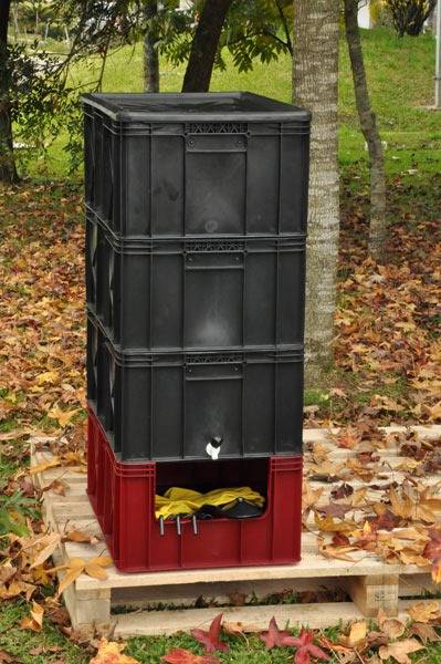 Conjunto de caixa para compostagem orgânica que pode ser feita em casa ou apartamento.
