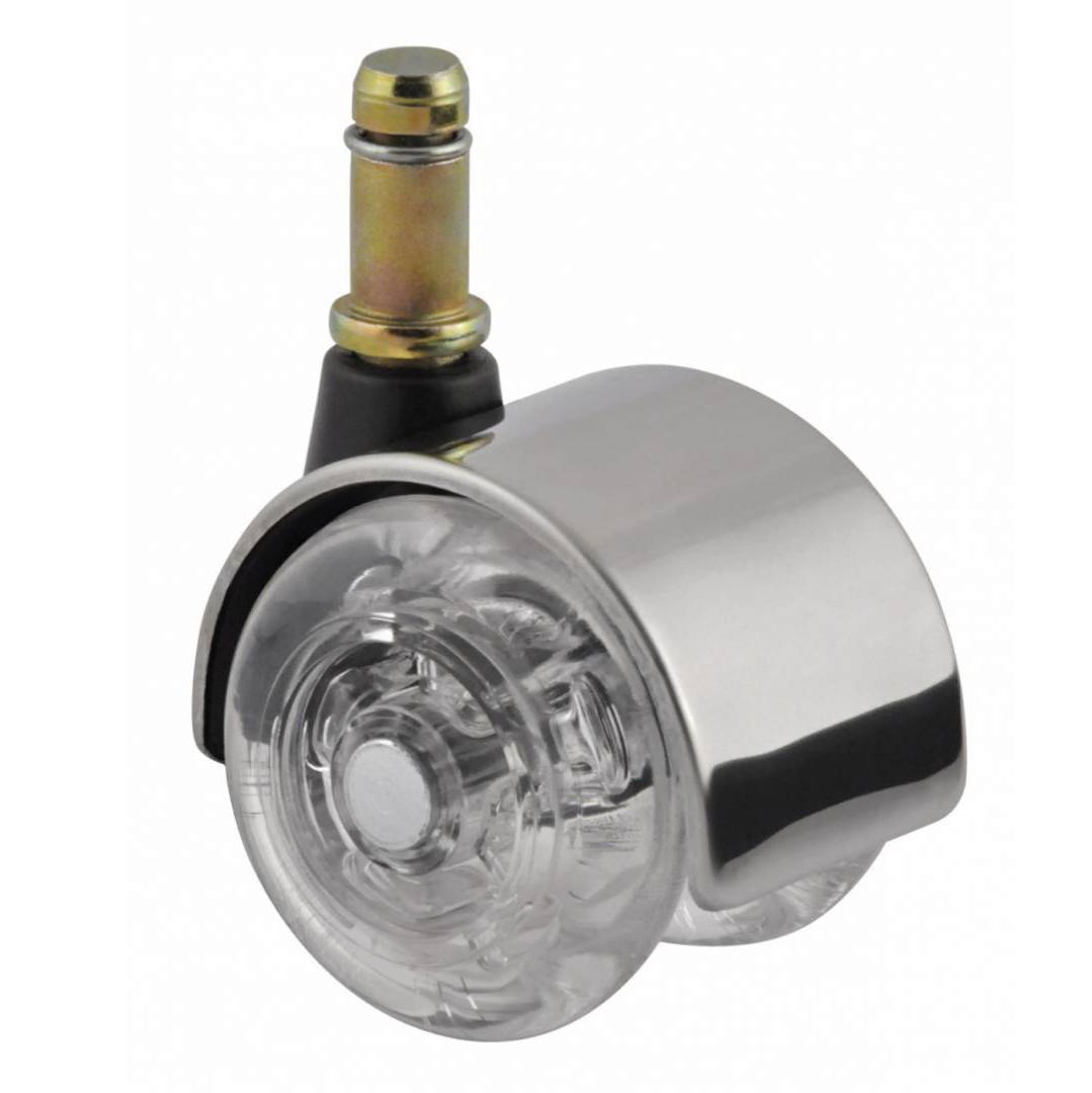 Rodízio em poliuretano cristal conhecido como roda de silicone cristal de Ø50mm. Anti-risco. Capa cromada. Design sofisticado.